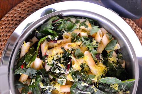 Drain pasta and gently toss with Swiss chard mixture. Transfer to a serving bowl.