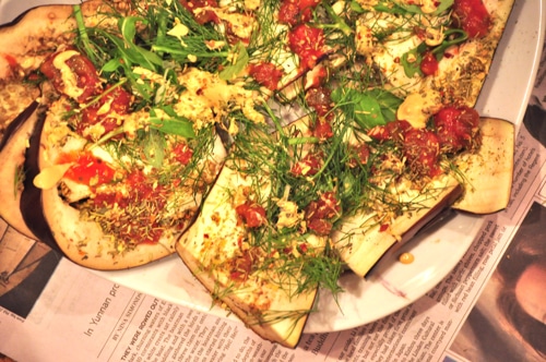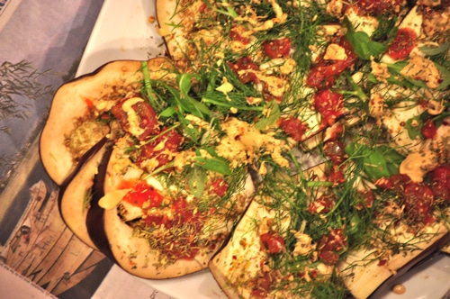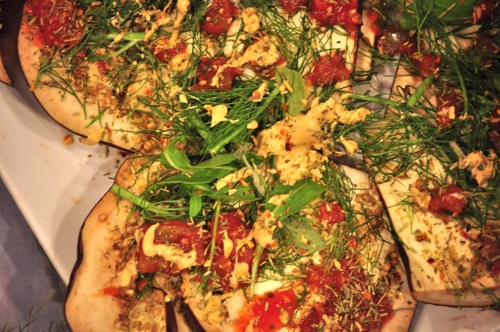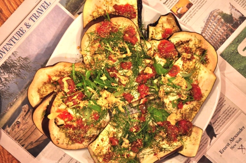 Spritz eggplant slices with olive oil; sprinkle with sea salt. Drizzle strained tomatoes atop eggplant along with arugula, dill, ground cashews and Dijon.