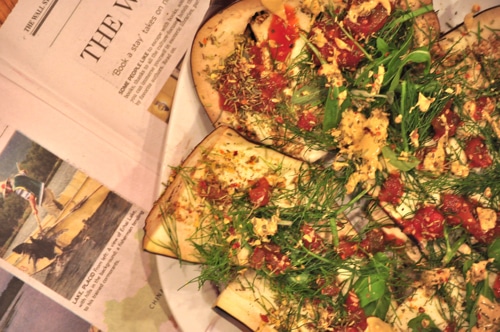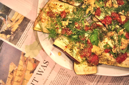Just a nice ol’ purple eggplant, some fresh greens and herbs along with my favorite tomato sauce – Pomi – it’s that odd looking tomato sauce that is from Italy… it’s in a cardboard box and the ingredients are simply: Tomatoes. Just how I like it. When a food has one ingredient and it’s a veggie – you surely can’t go wrong, can you?