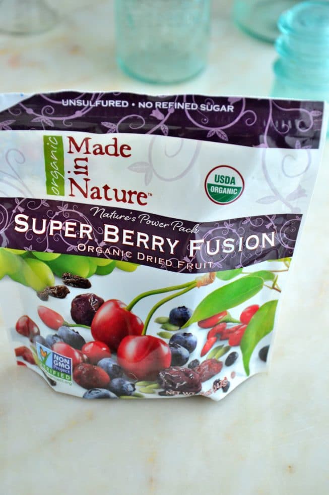 This is a combo of berries and they’re great tossed into baking recipes such as baked oatmeal or sweet breads or muffins. They’re naturally sweet and add a lovely touch of flavor without the sugar high. Check out these Autumn Baked Oatmeal Squares I made last year using the Made in Nature dried fruit. You can use these berries for this recipe!