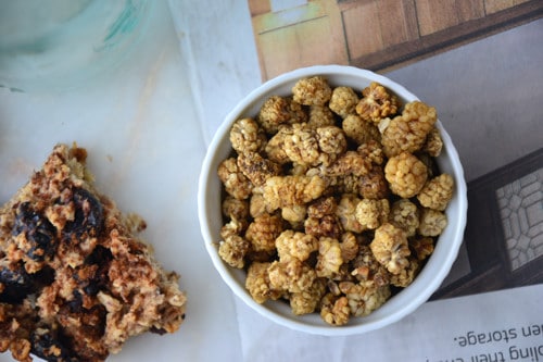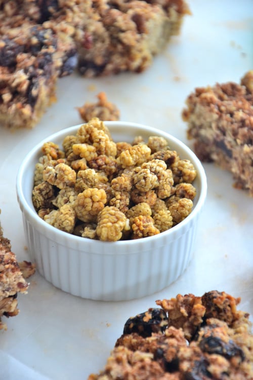 Well, because mulberries are quite possibly the greatest thing since…well, since I discovered the wonders of organic dried fruit! This past summer I found Made in Nature products popping up in all the health foods stores and I bought a few (or a ton of, hehe) bags of their dried fruits, which I’m obsessed with. Have I been living under a rock? These organic goodies are so good- I’m a little bit sad that I’ve been missing out on them the last few years. But I’ll get over it. You probably have heard me talking about their ridiculously outrageous flavor on Instagram.