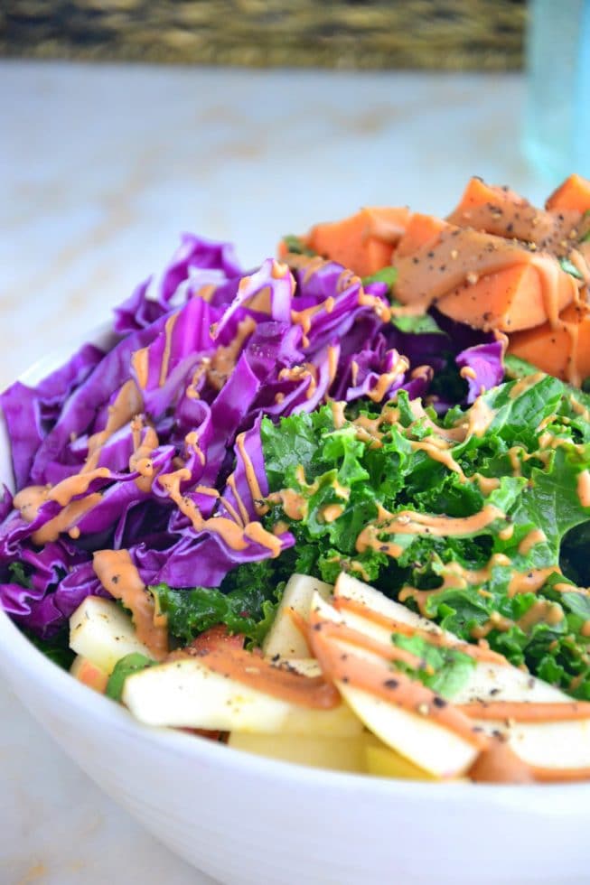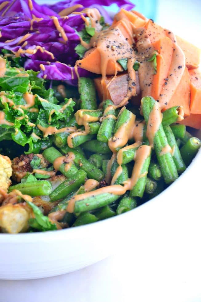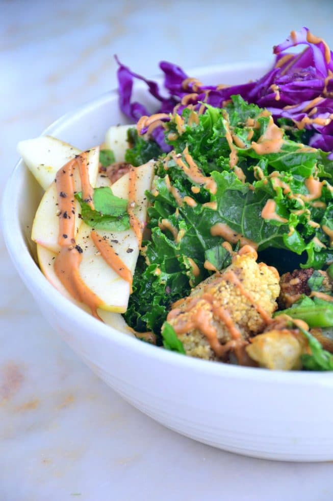 In a large bowl, combine the roasted sweet potatoes, cauliflower and steamed green beans. Add the kale and massage the chopped kale with your hands with the remaining 1 tsp. olive oil. Add the cabbage and apple.