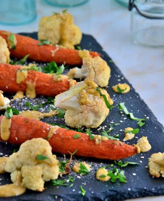 Place the cauliflower on a rimmed baking sheet with 2 tsp. olive oil and toss with sea salt and pepper. Roast for 20-25 minutes then remove from the oven.