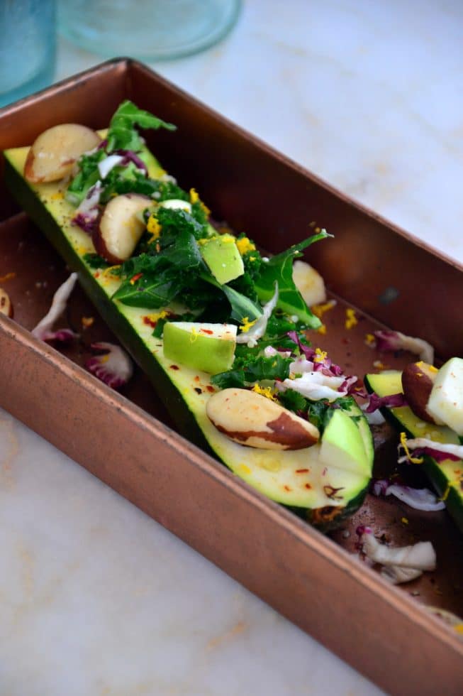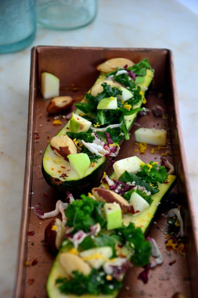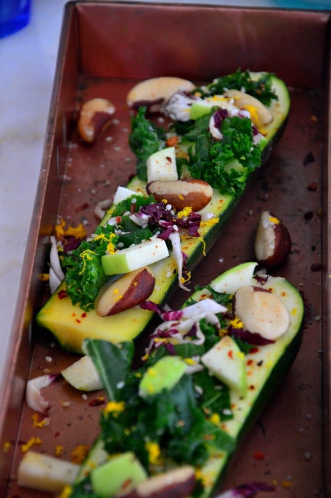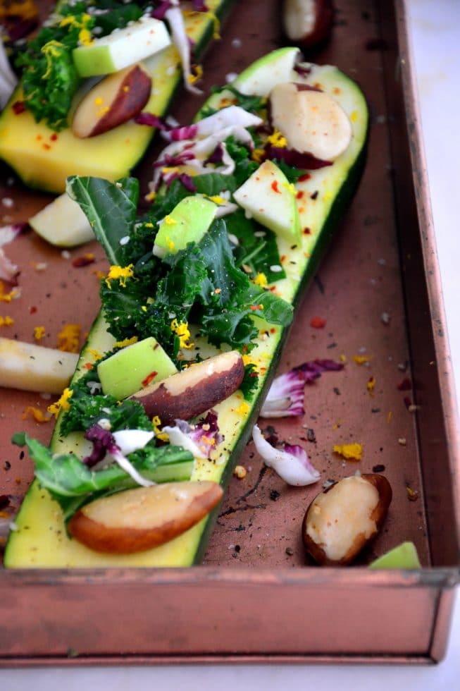 All you need to do is finely chopped a head of kale and massage it with a really good oil such as avocado oil or extra-virgin olive oil until it’s so tender and soft (about 1-2 minutes) with your hands. Then you slice the zucchini in half and layer on the massaged kale, radicchio, diced apples, Brazil nuts, freshly squeezed orange juice, orange zest, sea salt and pepper. I also added a pinch or two of crushed red pepper flakes for a bit of heat that adds the perfect flavor to these boats.