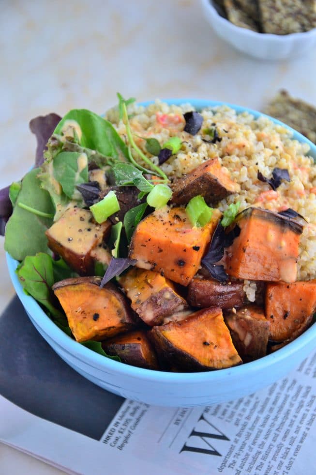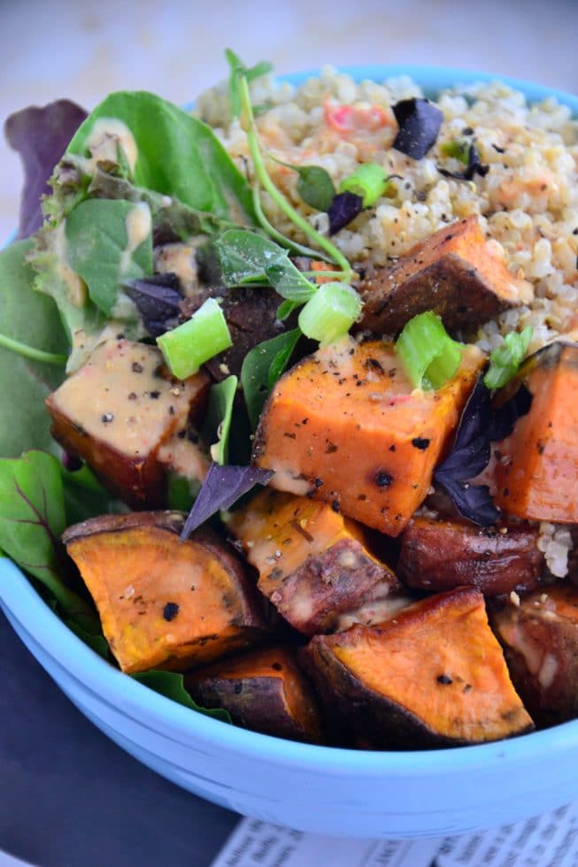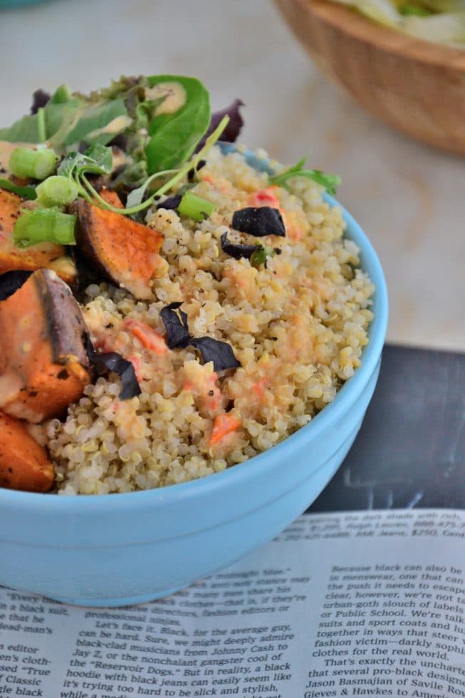 This bowl is a combination of roasted sweet potatoes, fluffy quinoa and the most amazing carrot and roasted red pepper ‘creamy’ dressing that I’ve ever made.
