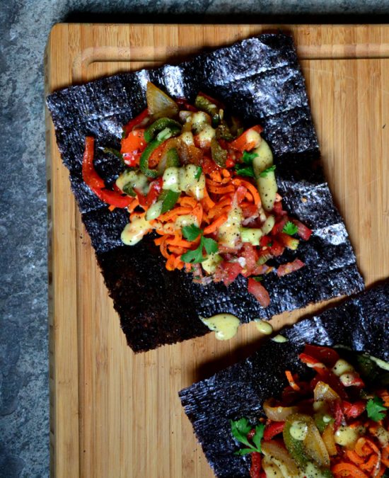 I love these veggie fajitas because they’re simple and that’s what the recipes in my kitchen are all about. Simple, simple, simple. I love tossing together lettuce wraps, tacos or fajitas when I’m in a hurry and need to get dinner into my belly without spending hours thinking about what to eat. To me, fajitas are fun and they were always my favorite meal to eat at home and when dining out as a kid. There’s something cozy and festive about fajitas that brings me back to those days when I was a little kid and I could put them together myself, starting with the veggies, then the toppings and wrapping them up and taking a bite. I think I got so excited about all of this because fajitas are considered a finger food!