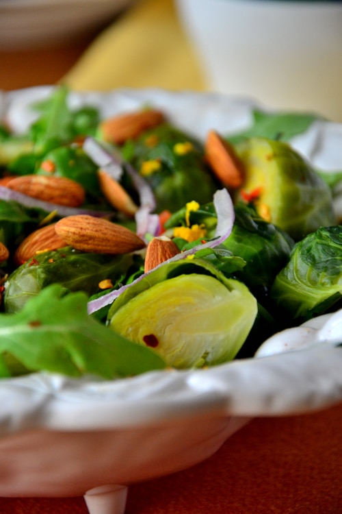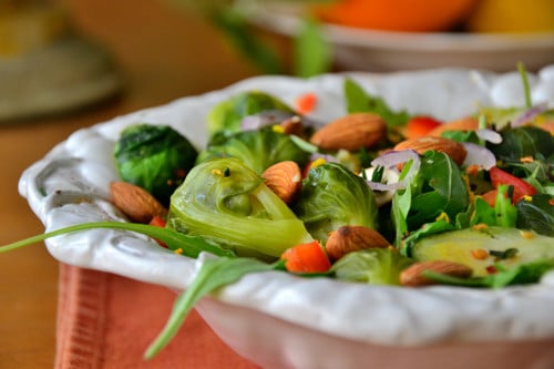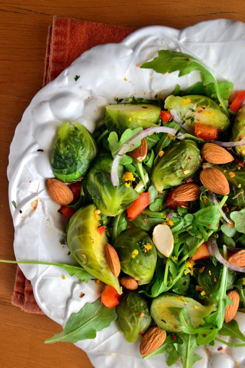 This salad is one of those simple dishes that can be tossed together for a summer BBQ or picnic, enjoyed in the fall while your husband/boyfriend/friend is eating nachos and watching Monday night football, whipped up in the middle of winter when arugula is still SO popular and so are these B. sprouts, tossed together in the spring for a fabulous Mother’s Day dish or just enjoyed as a mid-day snack or appetizer anytime before your main meal. I think you get the picture, right? It’s a pretty versatile meal that you’ll wanna make again and again. I’m not stopping you, that’s for sure.