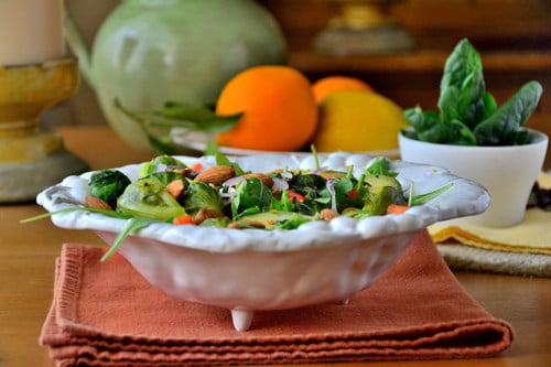 If you haven’t tried arugula, do me a favor and reach for the Earthbound Farm package so you can feel good about knowing it’s certified organic with no pesticides or herbicides. Then you can have a ball putting together my recipe below – it’s gotta lot of crunch and flavor to it. Almonds sub for croutons so there’s a hearty dose of protein and fiber in each bite of this baby. Go ahead, dig in!