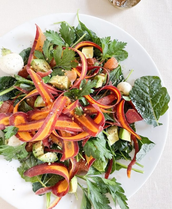 There’s something so easy breezy about a ribboned veggie salad – perhaps it’s the way the carefully peeled ribbons look on a platter or the ease of digesting the thinly sliced produce – either way, there’s nothing like sitting down to a beautiful meal that tastes just as good as it looks. Last week, you loved the carrot ribbon salad so I thought I’d use my favorite vegetable peeler (See below in SHOP the RECIPE. This one is amazing and so not like the old school peelers that never worked for me) again to share a tasty salad that doubles for lunch and dinner.