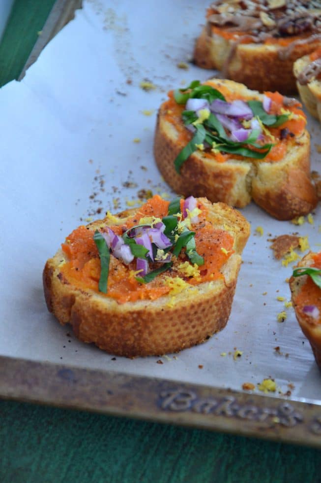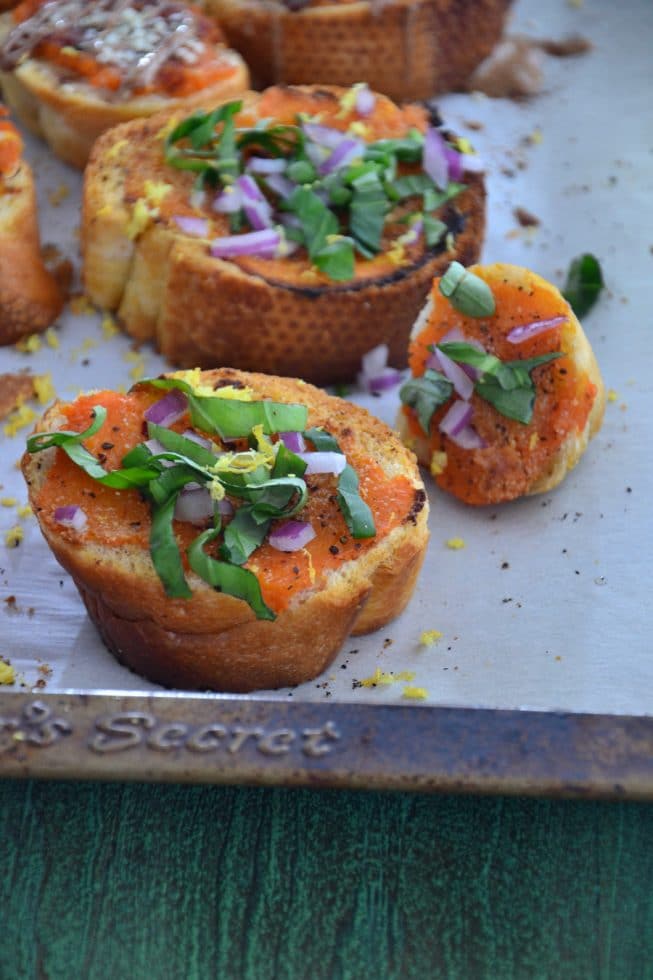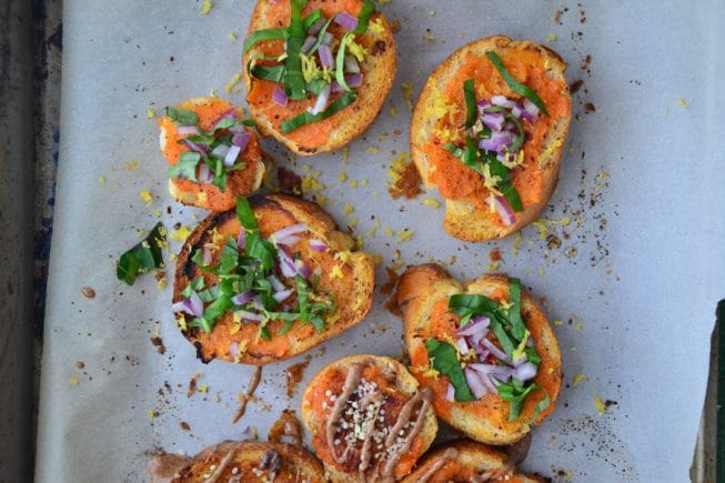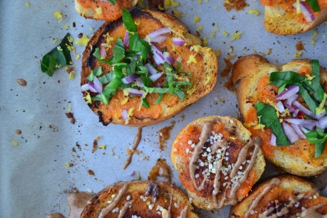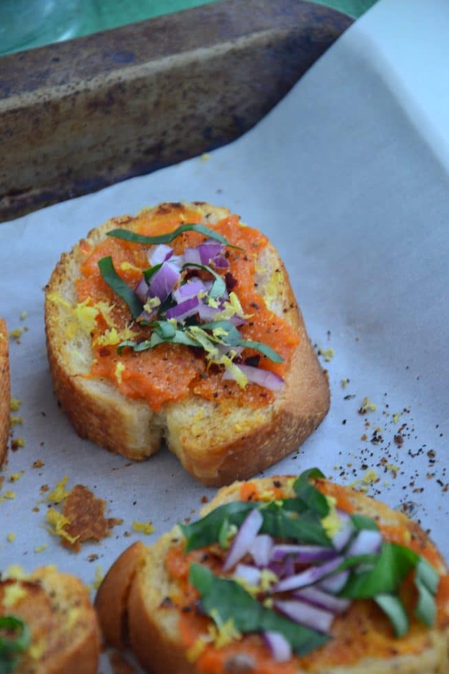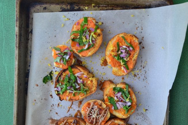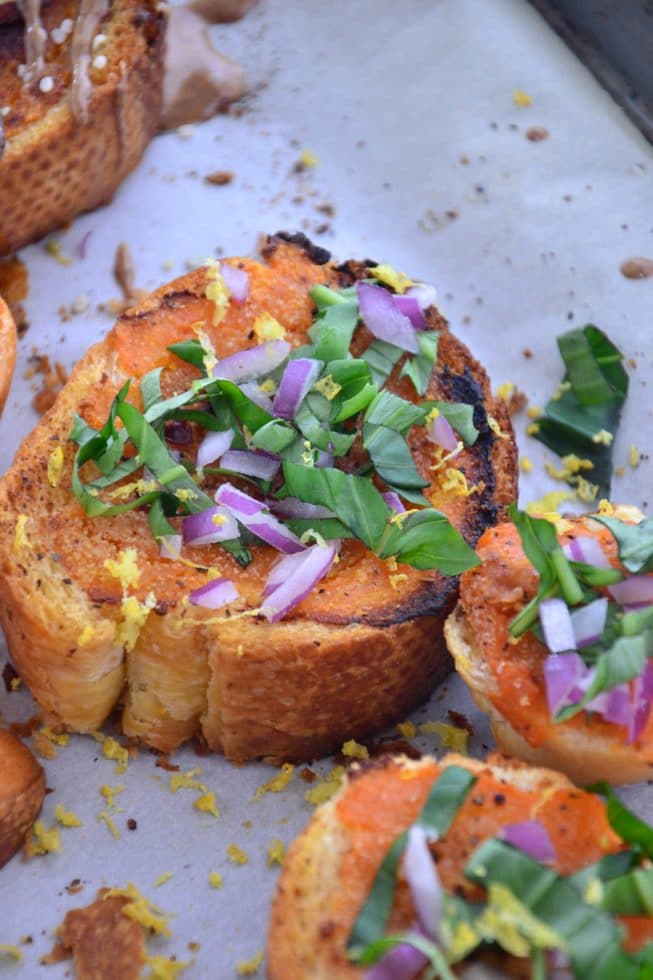Because I’m all about creating a lot of flavor with a few fresh ingredients, I opted to roast a few sweet potatoes just to perfection and then simply mash them together with sea salt, pepper before I spread it onto a toasted piece of gluten-free Italian bread and popped these pieces of toast back into the oven to warm up. The grand finale? To serve these babies with fresh lemon zest, diced red onions, fresh basil (ahhhhh the smell of fresh basil!) and a whole lotta love.