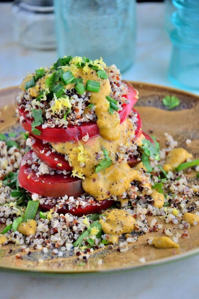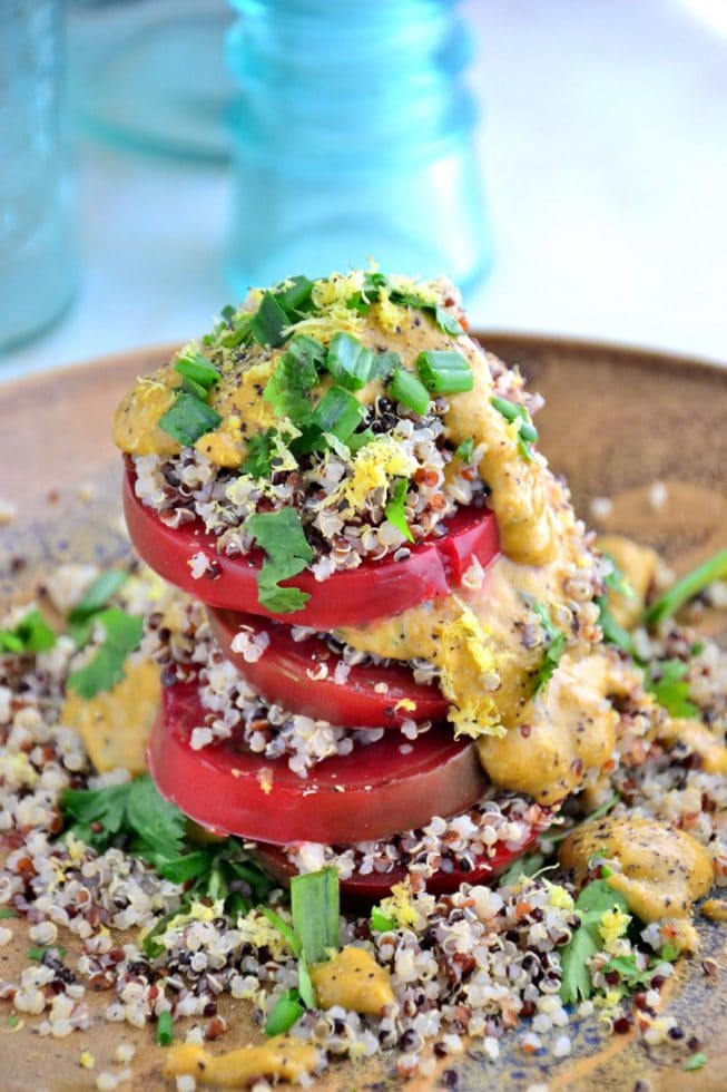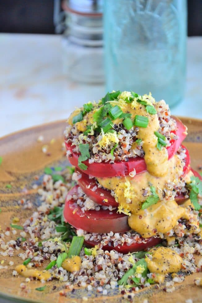 This Tomato Quinoa Tower is quite possibly the easiest recipe you’ll make all year. Well, maybe aside from oatmeal, but that’s not really a recipe. I know you’re thinking that this looks complicated but I assure you- it’s not. All you simply need to do is cook up a pot of quinoa and layer it with a big heirloom tomato, toss some fresh herbs on top and drizzle it with my Magical Carrot Sauce. O ya and don’t forget the fresh lemon zest on top; that’s a simple way to add a punch of fresh flavor and more natural sweetness to every bite.