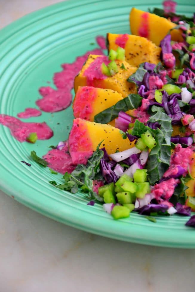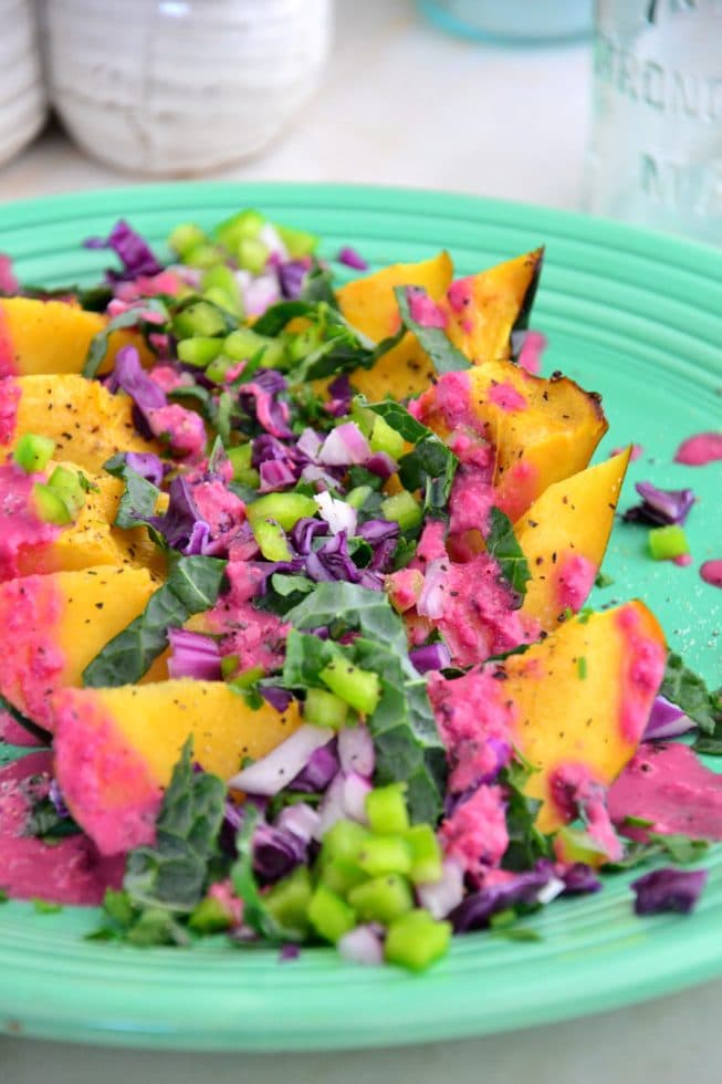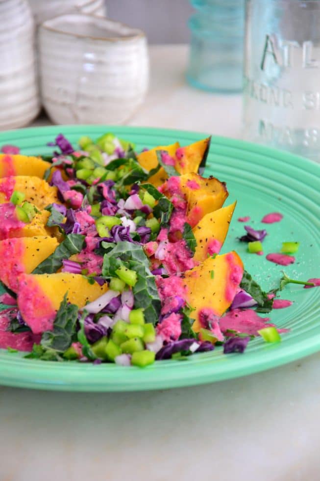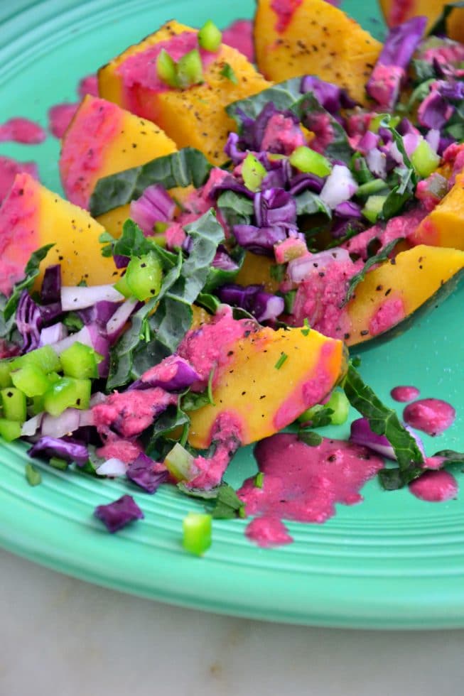 On a large serving platter, arrange the roasted squash and top with the chopped kale, cabbage, red onion, bell pepper, fresh cilantro, sea salt and pepper to taste. Drizzle with the beet dressing and serve immediately.