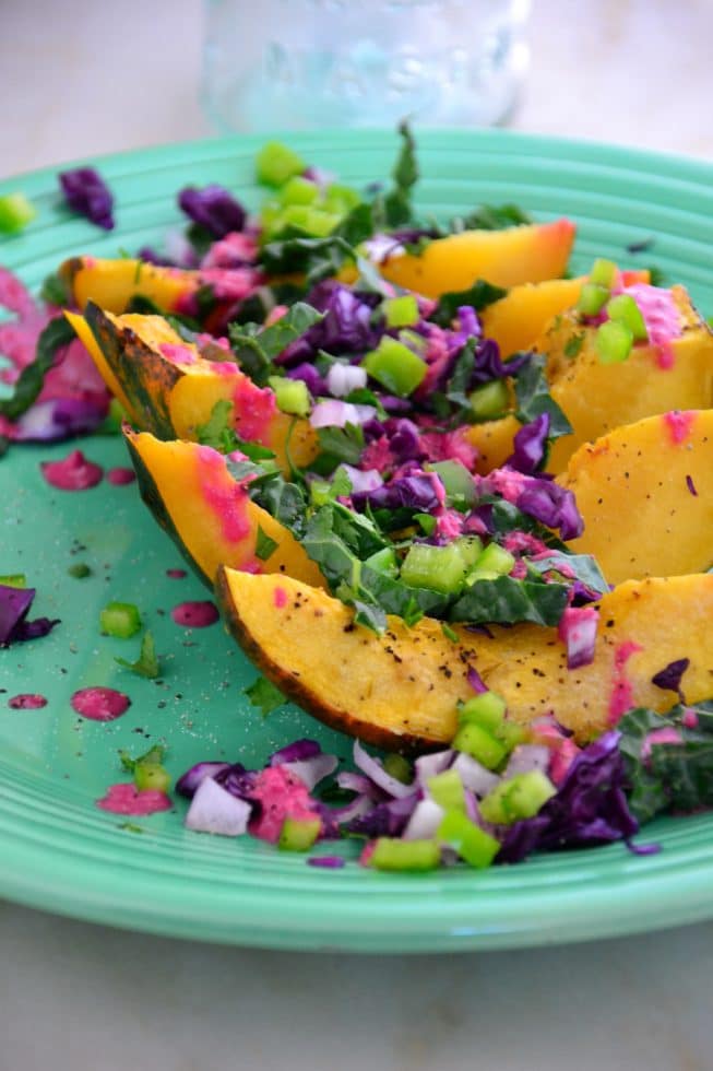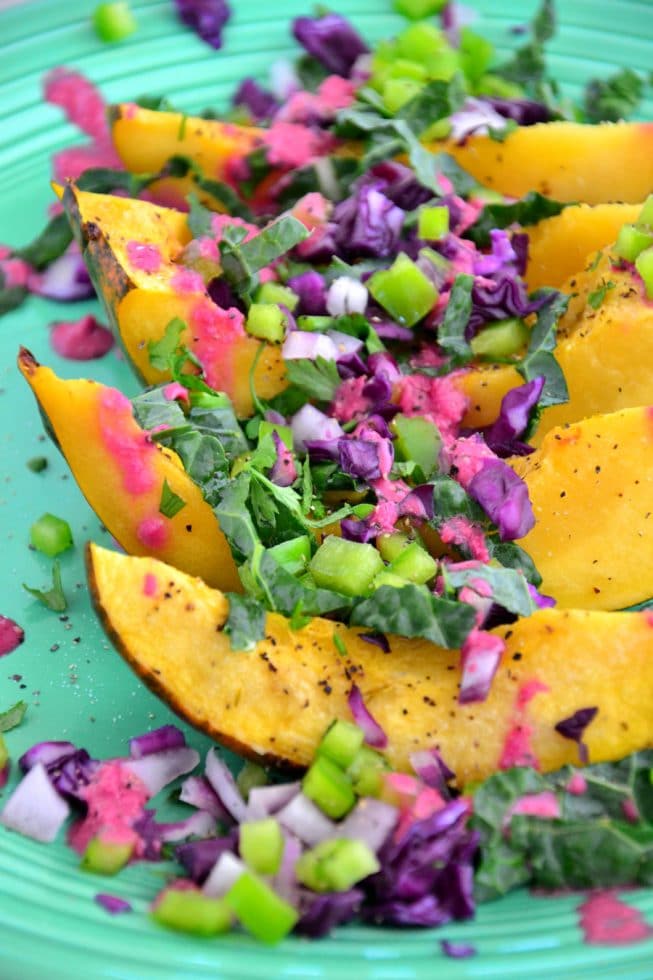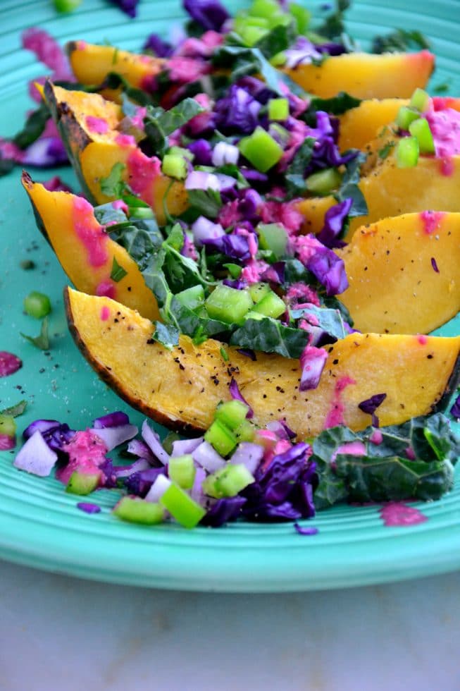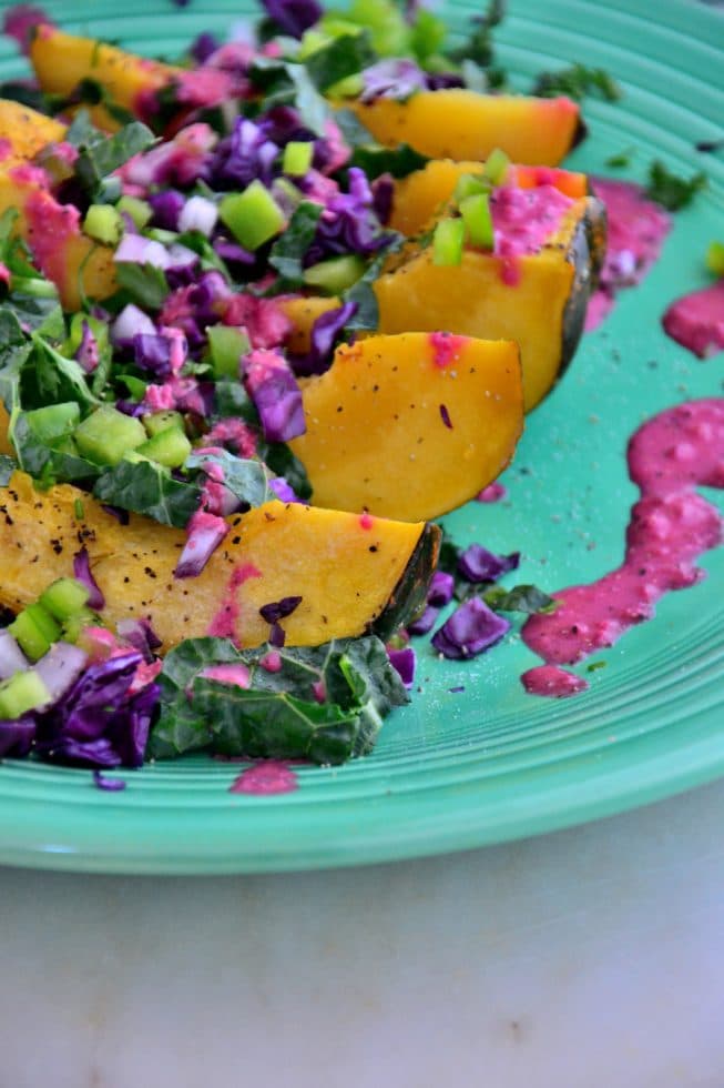Where did the summer go? It went way too fast, as always! I’m still holding onto the warm weather by sharing today’s recipe with you. This recipe is full of flavor, color and antioxidants to keep you feeling like it’s still summertime. Plus, it’s chock full of fruits and veggies (like clementines, beets, kale, purple cabbage and acorn squash) to keep you full and satisfied for a simple weeknight family dinner or a lovely (and super elegant) weekend dinner party. Don’t you just love these colors? So vibrant and beautiful!