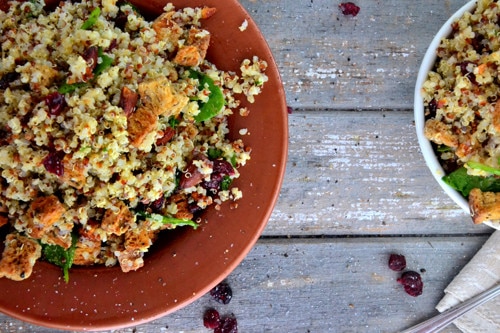 Quinoa Stuffing. Quinoa is another yummy bread alternative for this year’s stuffing. The rich color of red quinoa makes it a great option for fall. Add butternut squash, dried cranberries and pecans for a layer of sweet flavor. Another nutritious option is to add kale and mushrooms to your quinoa