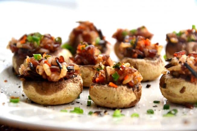 To make em, just mix a bit of cooked quinoa and rice with some carrots, pine nuts, onion and salsa- then plop this ol’ stuffing into the mushroom caps and bake away.