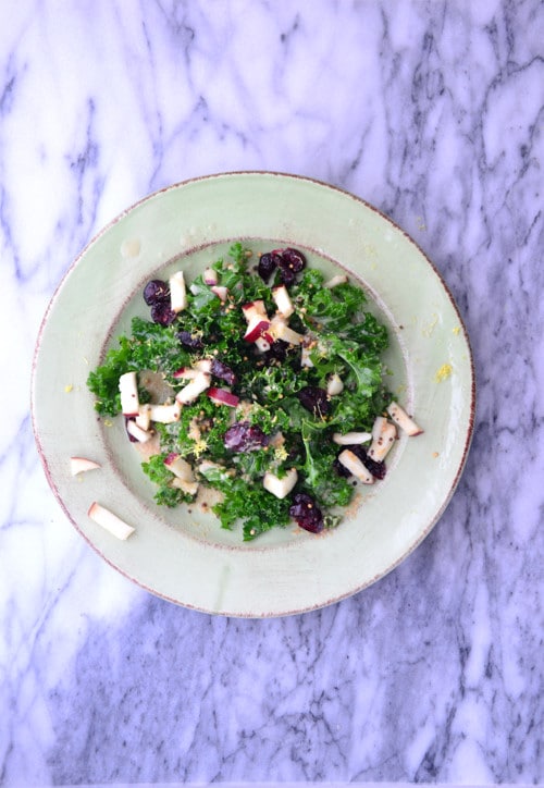 In a small bowl, whisk the tahini, water, lemon juice, 1 Tbsp. oil (add more if needed), mustard seeds, minced garlic, sea salt and pepper until smooth. Drizzle about half of the mixture (or as much as needed) over the kale mixture and use your hands to massage the kale for 1-2 minutes or until the kale leaves are soft, tender and dark green. Add the apple and cranberries; toss to combine. Add the lemon zest, to taste. Season to taste with sea salt and pepper and serve immediately.