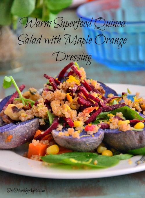 In a large bowl, toss quinoa with spinach, carrot, corn, beets, bell peppers and walnuts; add potato halves. Drizzle with dressing and gently toss to coat. Serve warm.