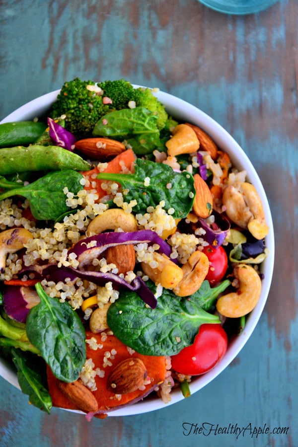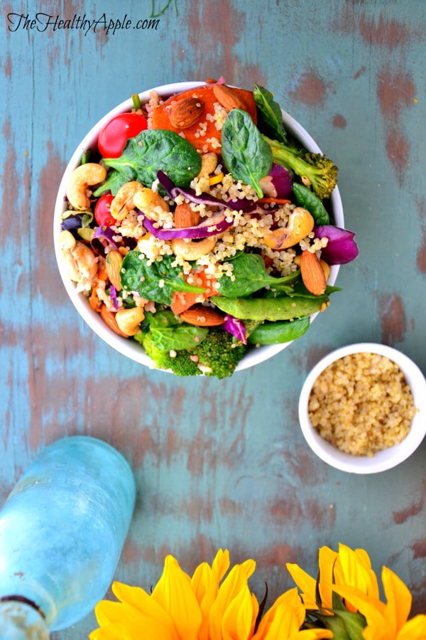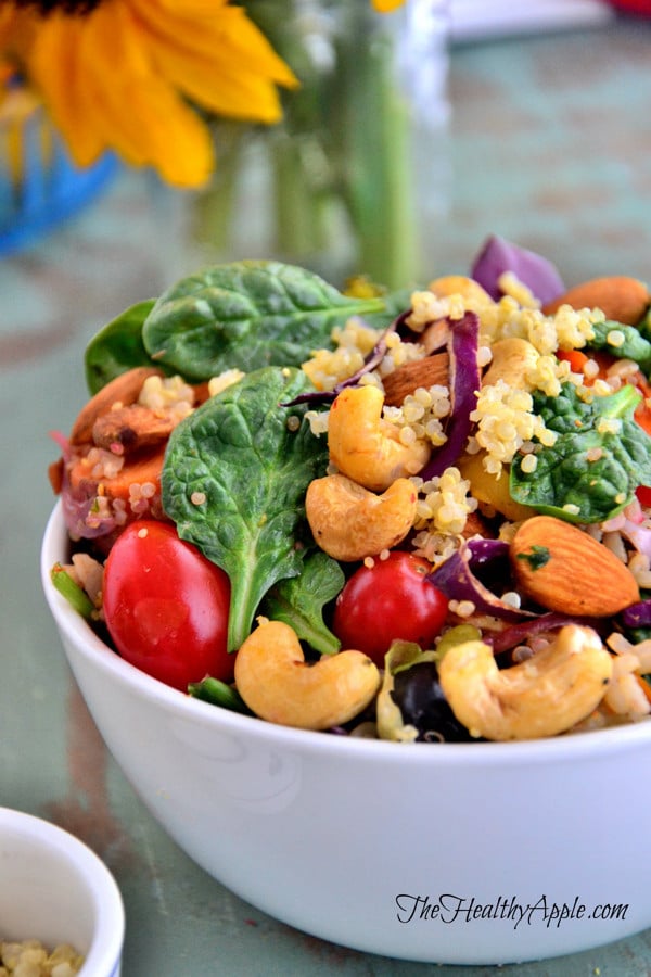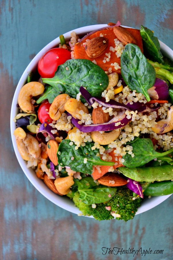 I’ve got a serious addiction for cashews and almonds mixed in this big ol’ bowl of cabbage, cherry tomatoes, quinoa, red cabbage, broccoli, sweet potatoes and more. Huge addiction. My favorite part? The soft texture of quinoa mixed with the crunchy nuts n’ cabbage. It’s a mouth full of fun!