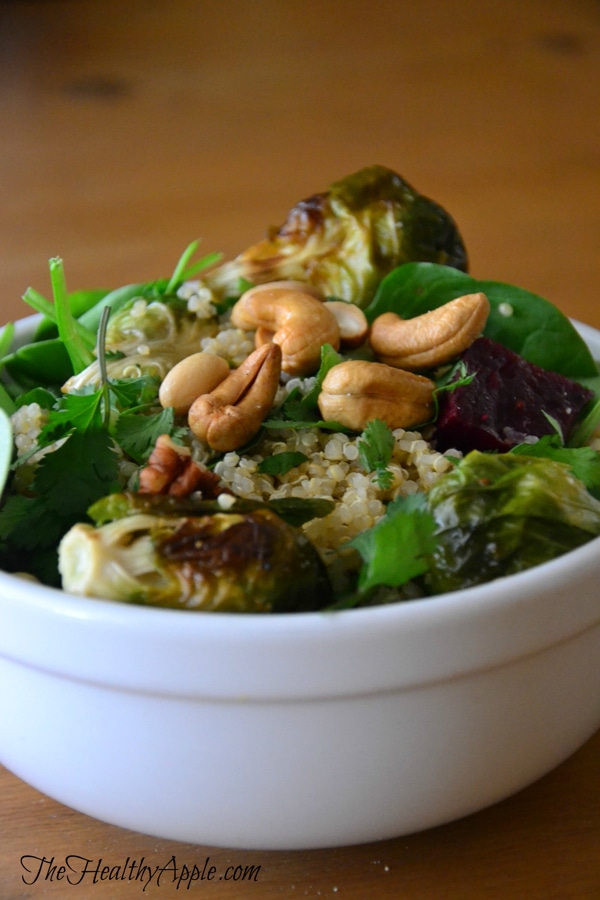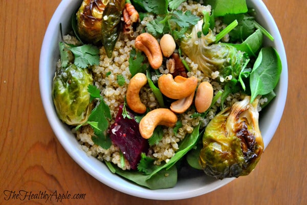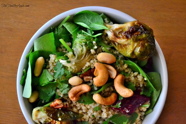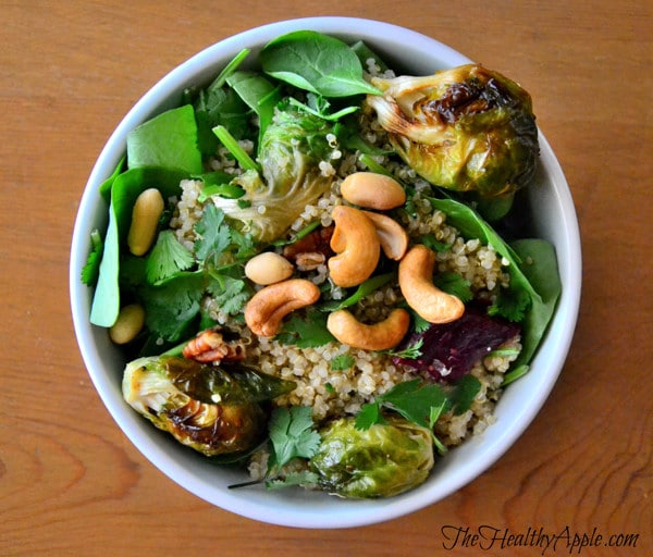 In a large bowl, combine cooked quinoa, Brussels sprouts, spinach, cilantro and cashews.