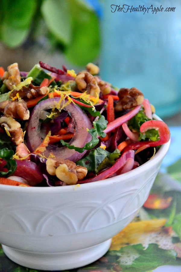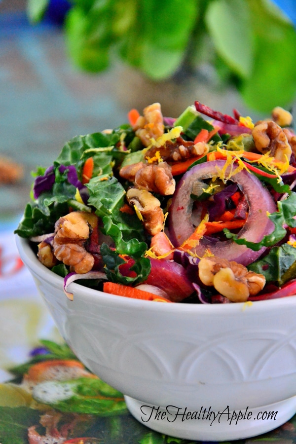 And as I mentioned a few months ago- I’m still addicted to walnuts so I have no problem tossing in a few more handfuls of them into this salad as I make it. There’s something about their soft, nutty texture that pairs perfectly with this dressing- it almost tastes like you’re eating a creamy nut butter. I think that’s my I love walnuts so much- they’re just so creamy and tender. Ya know?