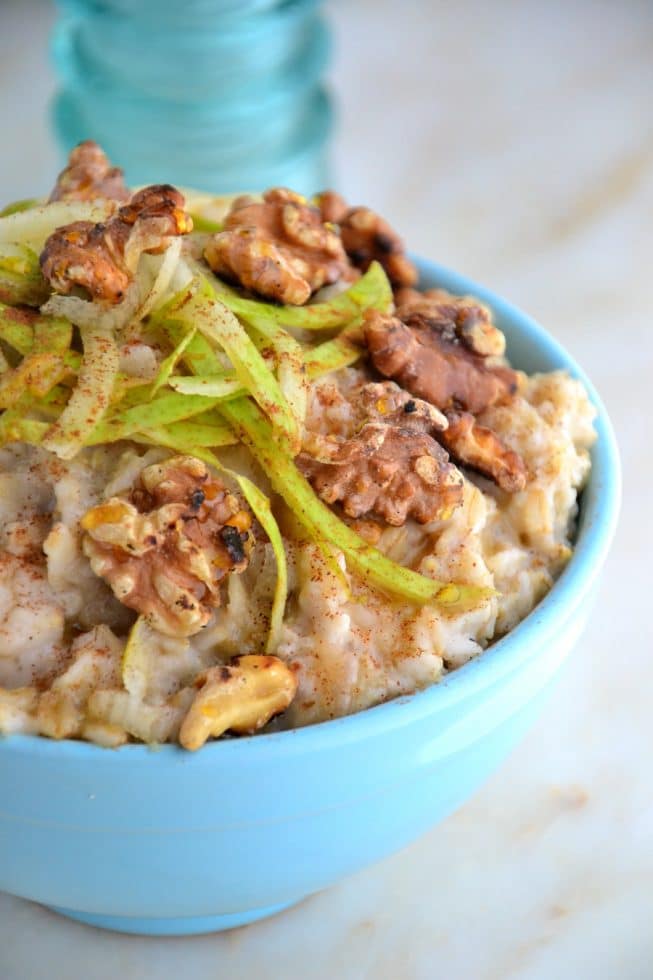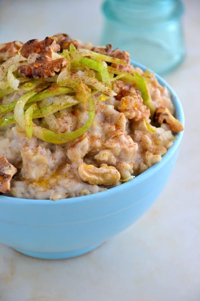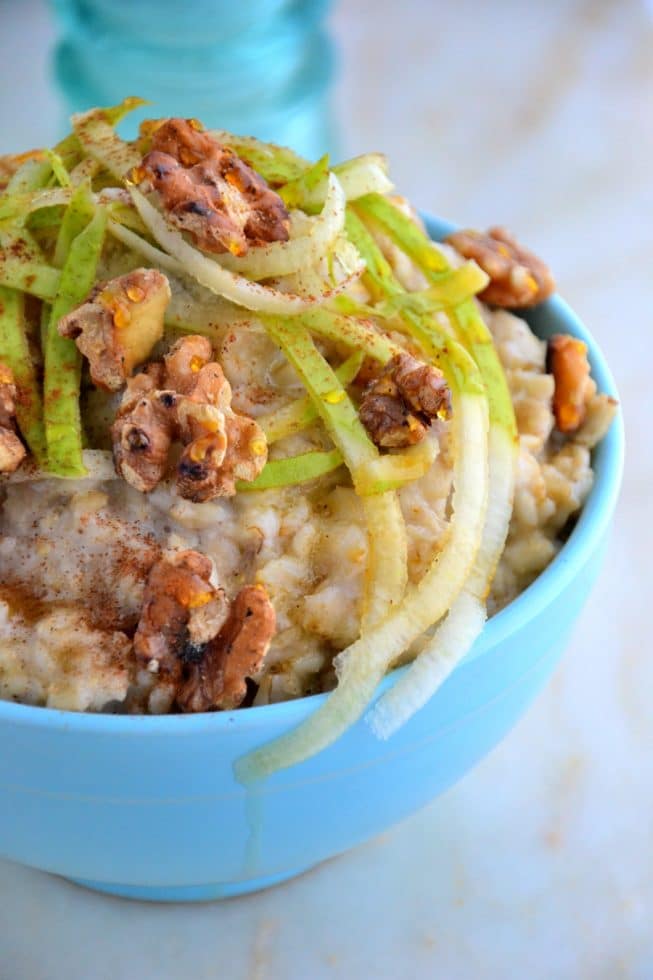 This Chai-Spiced Pear Oatmeal is delish- to say the least. She nailed this breakfast recipe (I also think it would be great to have the leftovers for dessert on a weeknight). I love spiralizing pears and I’ve spiralized them for salads with my clients in the past but I haven’t tried them ontop of an oatmeal recipe. I love the idea of added them to a sweet breakfast porridge like this. I also really loved how she used almond milk in this recipe- it makes the oats super creamy. I used unsweetened almond milk and it tasted delicious along with some pure maple syrup (or you could use honey, if desired) and coconut oil, vanilla extract and a few spices to give you a lovely chai flavor. Ali toasted the walnuts for a topping, which brings out their naturally hearty n’ toasty flavor and makes them extra delicious (toast your nuts in a skillet anytime you can- you’ll be pleasantly surprised at how much more delicious they taste).